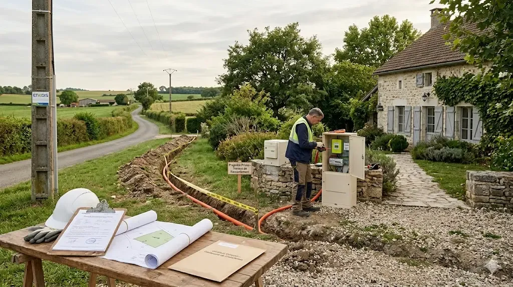 Le raccordement désigne les travaux physiques qui relient la maison ou le terrain au réseau public de distribution d’électricité : câbles, coffret de livraison, compteur (souvent Linky), branchement aérien ou souterrain. Ce sont Enedis ou une ELD (Entreprise Locale de Distribution) qui pilotent ces travaux.